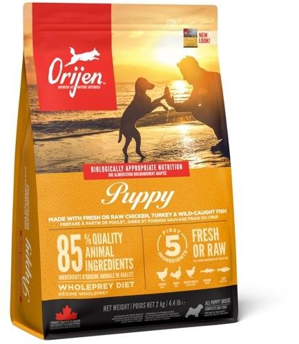 Granule pre šteniatka – pre malé a stredné plemená šteňacieho veku s normálnou aktivitou, morčacia, kuracia a rybia príchuť, hmotnosť balenia 2 kg, suché, hrubé bielkoviny 38 %, tuky (hydinový a rybí ), špecifiká zloženia bez GMO Orijen Puppy je plnohodnotné krmivo pre psov vytvorené špeciálne na potreby šteniat malých a stredných plemien. Obsahuje vysoký podiel proteínov z voľne chovaných kurčiat a moriek, rýb lovených v prír