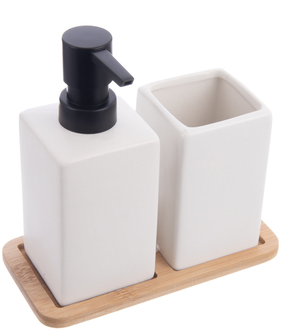 Sada kúpeľňových doplnkov – dávkovač mydla, pohárik na kefky a tácka, k umývadlu, hranatý tvar, materiál plast a bambus, biela farba