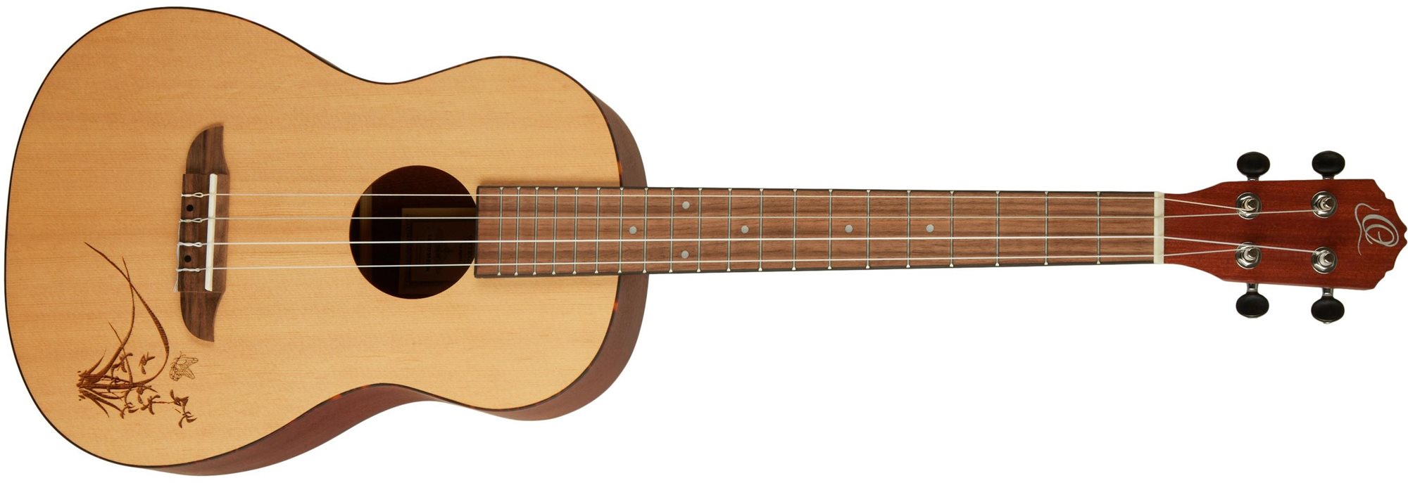 Ukulele – barytónové, nylonové struny, 18 pražcov, vrstvený korpus, povrchová úprava mat, predná doska smrek, zadná doska sapele, luby sapele, krk mahagón, hmatník orech, menzúra 485 mm, šírka nultého podvalu 38 mm Malé kompaktné telo…