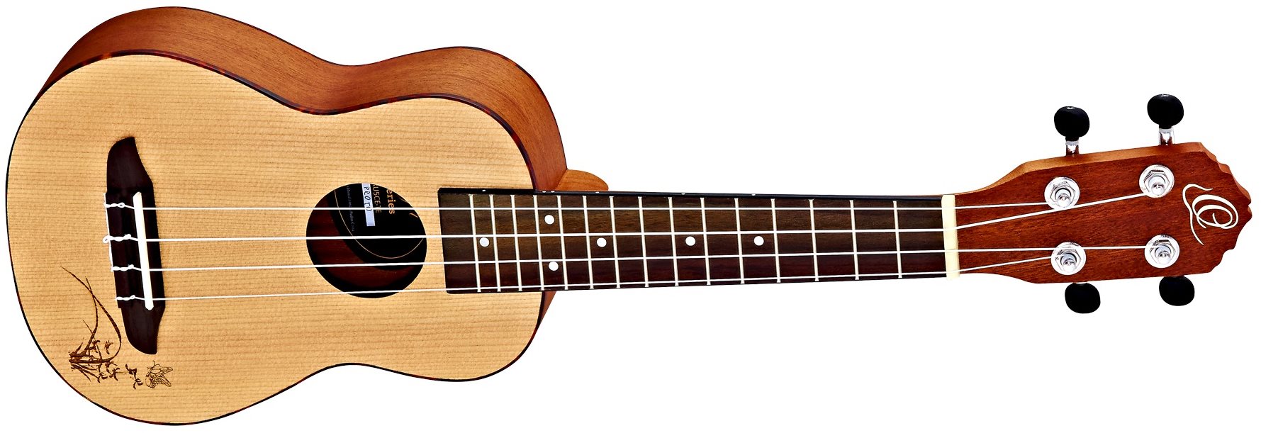 Ukulele – sopránové, nylonové struny, 15 pražcov, vrstvený korpus, povrchová úprava mat, predná doska smrek, zadná doska sapele, luby sapele, krk mahagón, hmatník orech, menzúra 350 mm, šírka nultého podvalu 36 mm Akustické ukulele ORTEGA RU5-SOje ideálnou voľbou pre všetkých začínajúcich hráčov. Jeho kúzlo spočíva v tom, že sa na ňom veľmi ľahko a rýchlo naučí hrať takmer každý. Vrstvený korpus je vyrobený z p
