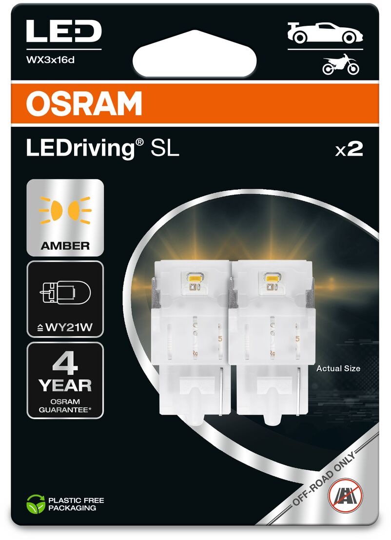 LED autožiarovka WY21W – pätica W3x16d, na predné smerovky a zadné smerovky, výkon 1,3 W, napätie 12 V, svetelný tok 55 lm, 2 autožiarovky v balení, off-road použitie, výbojka nemá homologizáciu na použitie na pozemnej komunikácii V balení sa ukrýva 2 ks LED žiarovky OSRAM LEDriving SL WY21W Žltá 12 V dva kusy v balení.