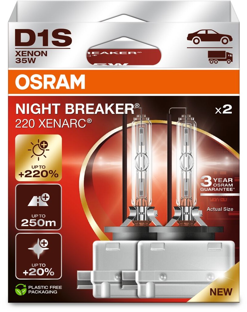 Xenónová výbojka – výkon 35 W, napätie 85 V, svetelný tok 3200 lm, maximálna chromatickosť 4500 K, farebná teplota neutrálna biela a studená biela, pätica P32d-2, životnosť 3000 h (150000 km), 2 kusy v balení, použitie na bežnú prevádzku Xenónová výbojka Osram Xenarc Night Breaker D2SZaobstarajte svoje vozidlo novými xenónovými výbojkami, ktoré vynikajú skvelým dosvitom a vyšším jasom, čo zlepšuje viditeľnosť na ceste. Xenónová výbojk