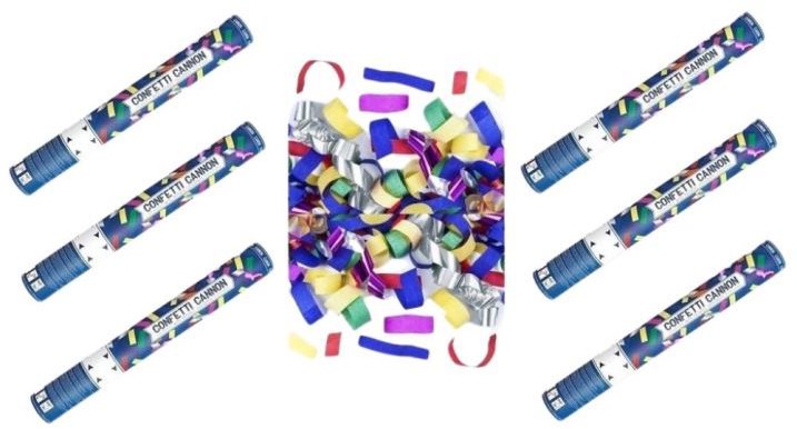 Konfety – vystreľovacie, vhodnou príležitosťou je oslava, večierok a silvester, prúžky, metalické, papierové, viacfarebné, 6 kusov v balení, veľkosť tubusu 40 cm Vystreľovacie konfety Párty konfety zaistia efektný výstrel, ktorý zaručene zaujme hostí a dodá každej oslave originálny okamih. Sú vyrobené z papiera, ktorý podporuje ekologickejší prístup. Vďaka met