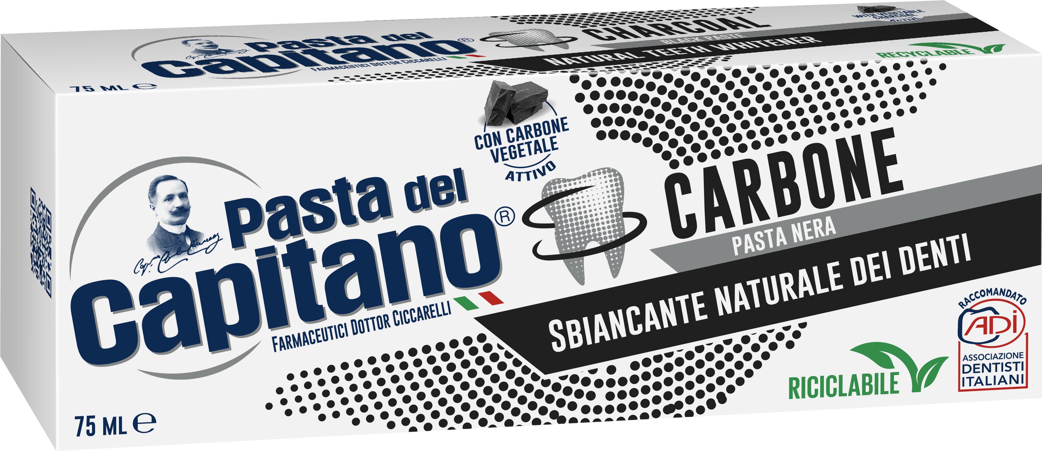 Zubná pasta – bieliaca, s aktívnym uhlím, bez sulfátov, objem 75 ml Zubná pasta PASTA DEL CAPITANO Charcoal je zubná pasta, ktorá pomáha obnoviť prirodzenú belosť zubov bez toho, aby poškodzovala zubnú sklovinu. Obsahuje Sulfetal Zn, špeciálnu molekulu obohatenú o zin