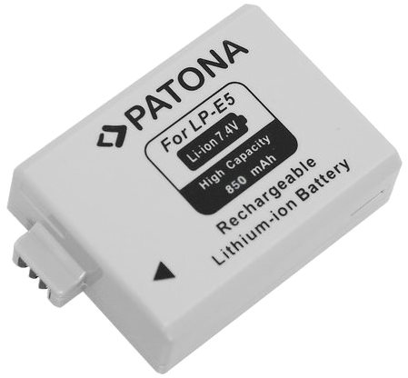 Batéria do fotoaparátu – vhodná pre Canon EOS 1000D, EOS 450D a EOS 500D, Li-Ion článok, kapacita 0,85 Ah, napätie 7,4 V, nie je originálna Hľadáte kvalitnú batériu pre váš fotoaparát? Stratila svoju pôvodnú výdrž alebo chcete druhú pre dlhšie nahrávanie? Správnym riešením je táto batéria Paton určená ako alternatíva za Canon LP-E5, ktorá