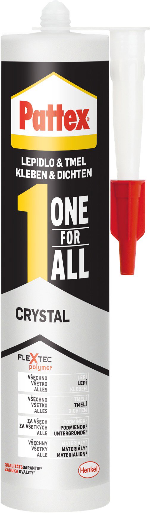 Lepidlo – montážne, Montážne lepidlo PATTEX One for All Crystal. Priehľadné univerzálne montážne lepidlo PATTEX One for All Crystal je jedinečnou kombináciou montážneho lepidla a tmelu v jednom na použitie v interiéri aj e