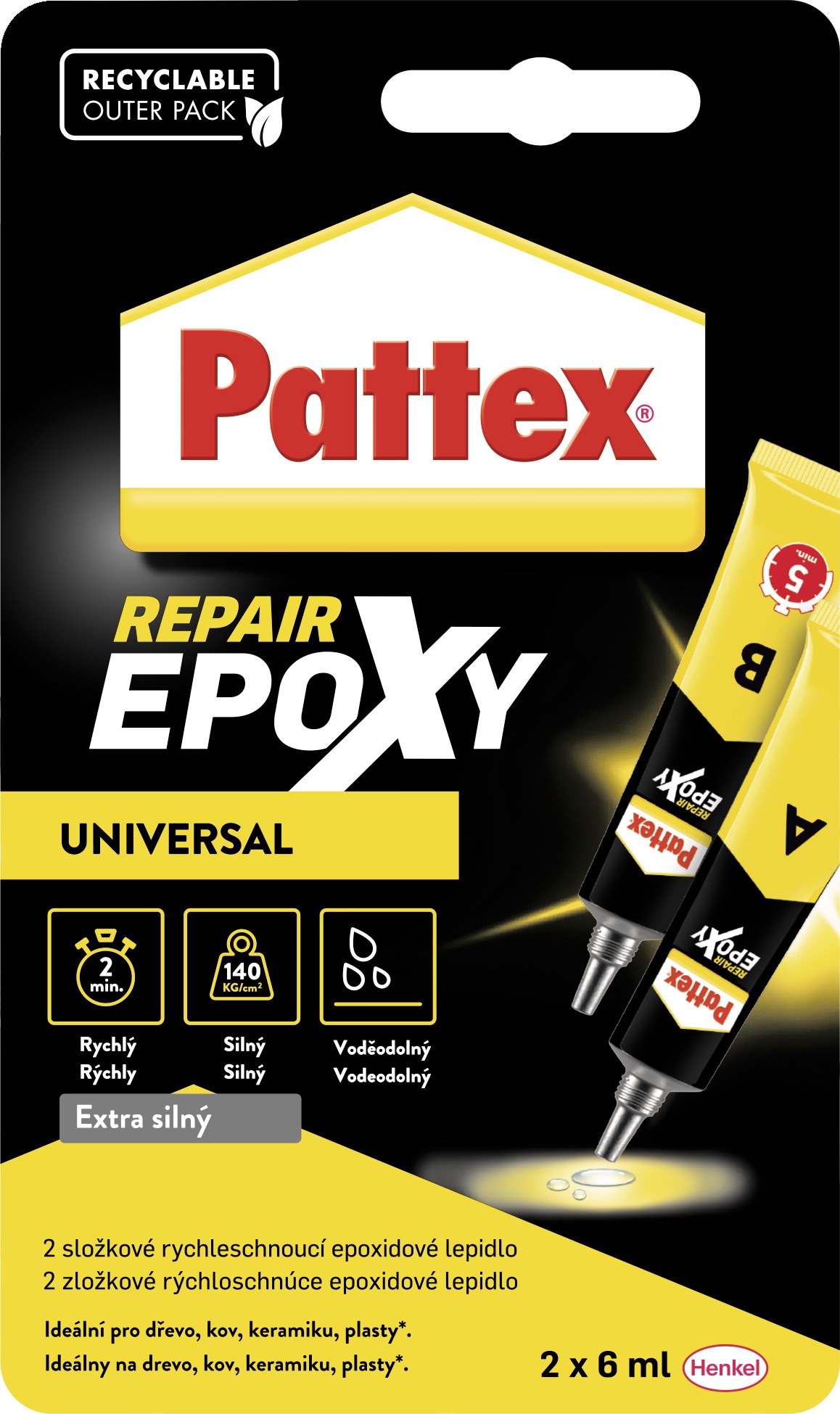 Dvojzložkové lepidlo – epoxidové lepidlo, pattex, dvojzložkové, univerzálne, objem 12 ml, tuba, odolné proti vode Lepidlo PATTEX Repair Epoxy Universal predstavuje silné 2-zložkové epoxidové lepidlo vhodné na permanentné opravy, fixácie a lepenie rôznych materiálov. Použiť ho môžete na drevo, kov, sklo, keramiku