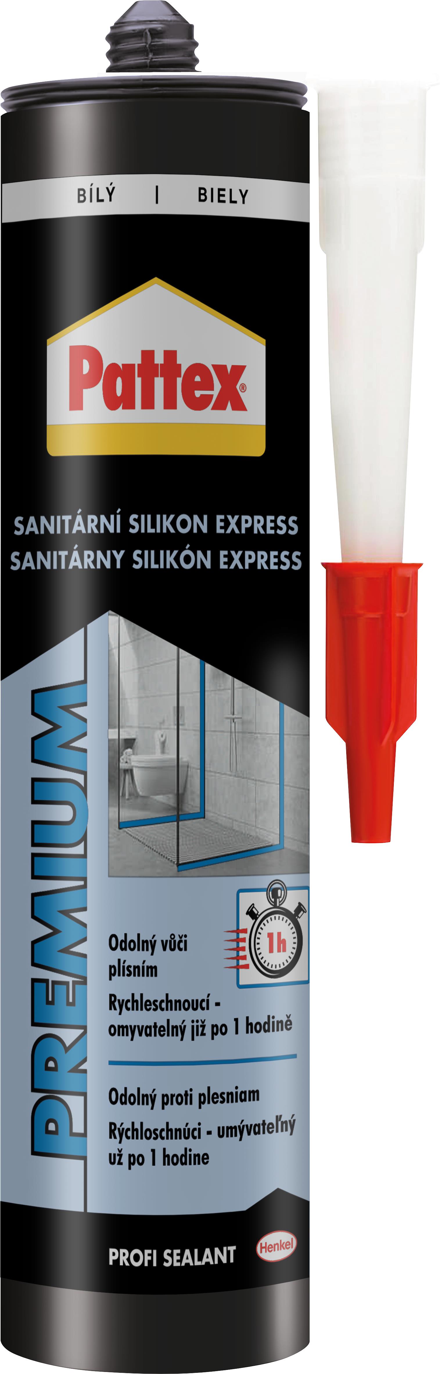 Silikón – acetátový, sanitárny, v kartuši, rýchloschnúci, odolný proti vode, vlhku a plesniam/hubám, doba spracovateľnosti 5 min, objem 280 ml, biela farba Sanitárny silikón PATTEX Express predstavuje expresný tmel na báze špeciálneho silikónu. Tmelí škáry v kúpeľniach a kuchyniach, okolo vane, sprchovacieho kúta, toalety aj drezov. Je skvele priľnavý ku