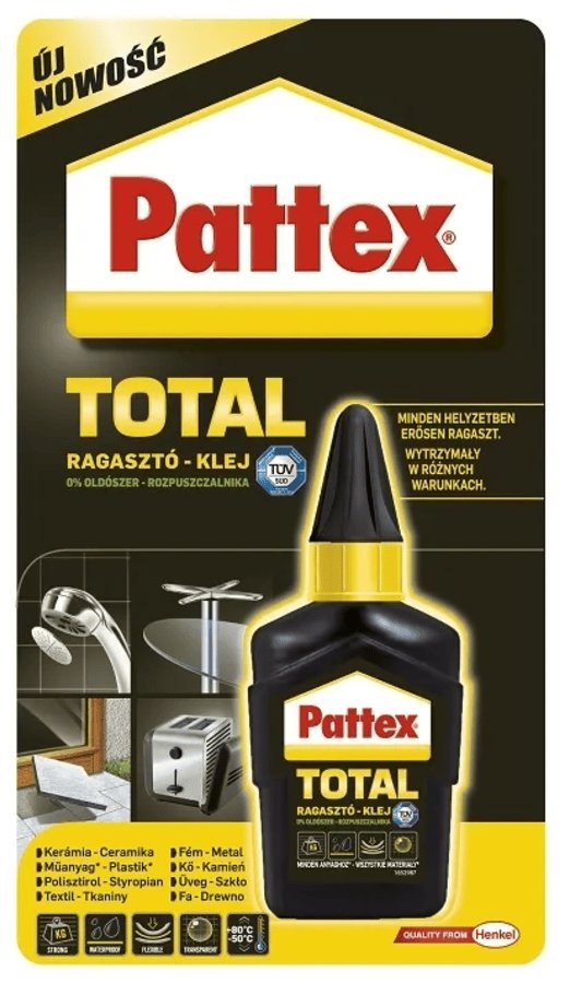 Tekuté lepidlo – univerzálne, na lepenie aj utesnenie, vhodné do interiéru aj exteriéru, možno použiť takmer na všetky materiály PATTEX Total predstavuje univerzálne lepidlo, ktoré zaistí lepenie aj utesnenie. Môžete ho použiť takmer na všetky materiály, ako je omietka, galvanizované povrchy, kov, betón, hliník, polystyrén, ker