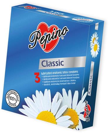 Kondómy – klasické, latexové, bežná lubrikácia, veľkosť 53 × 180 mm (Š×D), hrúbka 0,06 mm, 3 kusy v balení PEPINO Classic sú anatomicky tvarované kondómy z prírodného latexu s rezervoárom. V krabičke nájdete 3 kusy prezervatívov v prírodnej farbe, s hladkým povrchom a nominálnou šírkou 53 mm. Sú vlhčené si