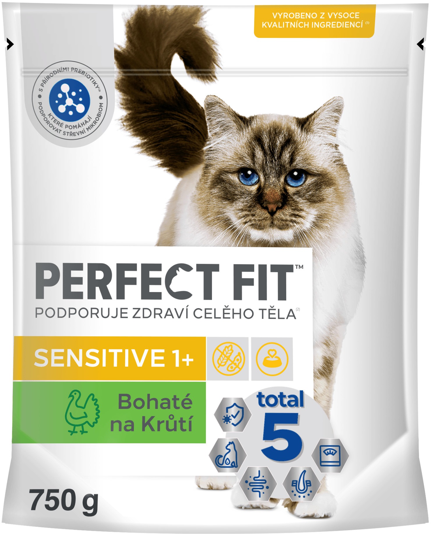 Granule pre mačky – dospelého veku s normálnou aktivitou, morčacia príchuť, hmotnosť balenia 0,75 kg, suché, hrubé bielkoviny 14 %, bez obilnín, špecifiká zloženia sensitive Granuly pre mačky Perfect Fit Sensitive s morčacím mäsom poskytujú dospelým mačkám kompletnú suchú stravu bohatú na kvalitné bielkoviny z morčacieho mäsa. Kukurica, ryža a rastlinné bielkovinové extra