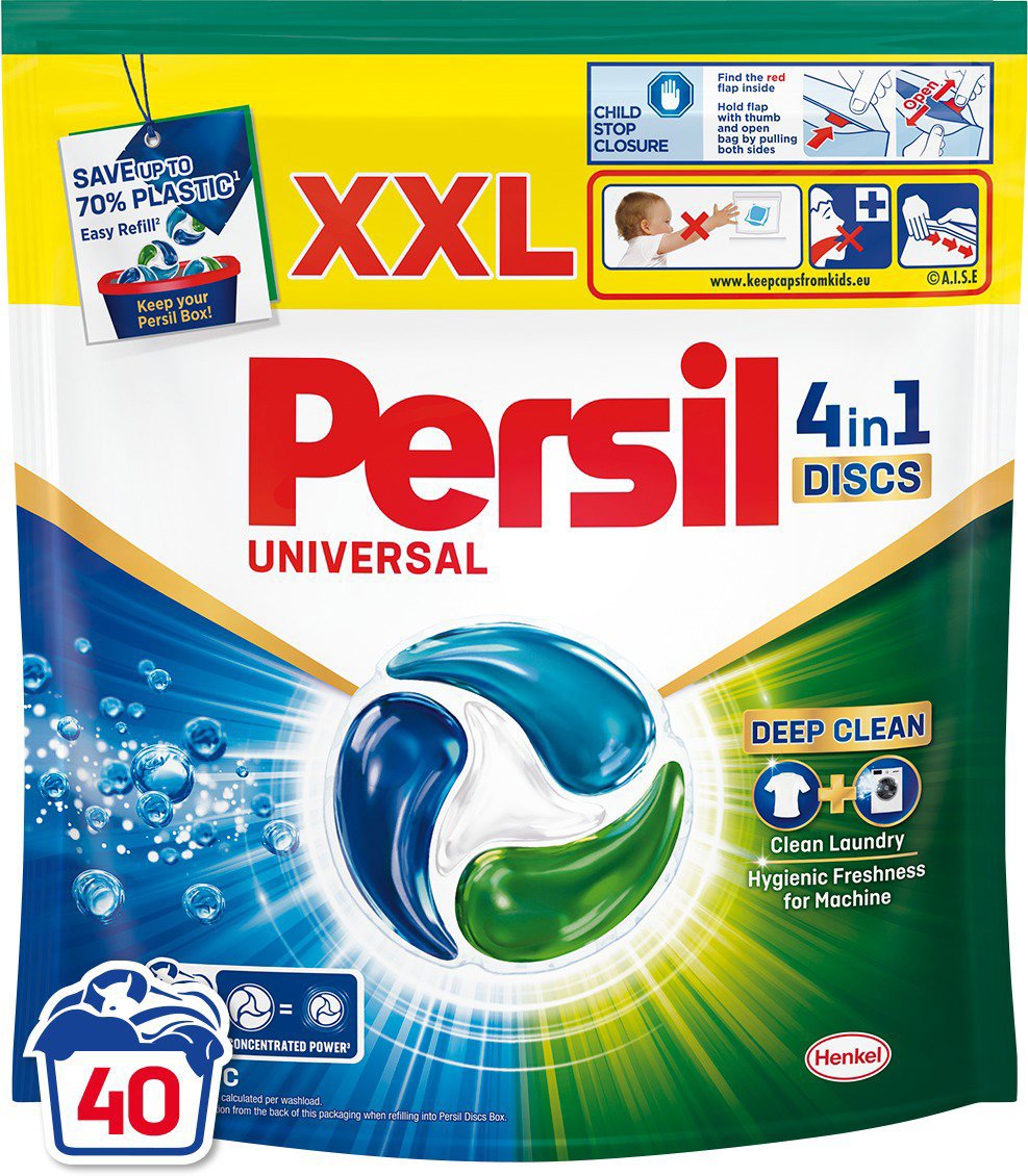 Kapsuly na pranie – typ bielizne: univerzálna, farebná bielizeň, na bežné pranie, 40 kusov v balení Persil 4 in 1 Universal Discs predstavujú revolučné riešenie na starostlivosť o bielu a svetlú bielizeň. Tieto kapsuly kombinujú štyri kľúčové vlastnosti – odstránenie škvŕn, dlhotrvajúcu sviežosť, oc