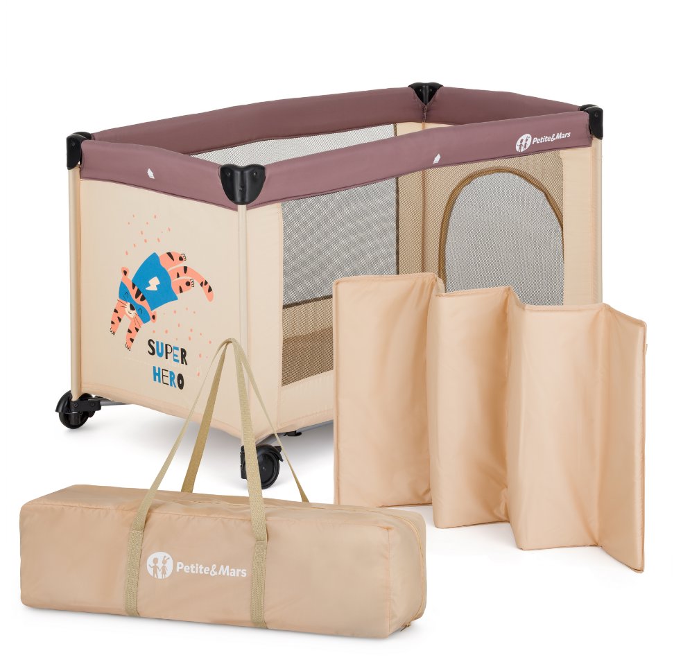 Cestovná postieľka – pre deti, nosnosť 15 kg, na kolieskach, hranatá, s bočnými dvierkami, s cestovnou taškou, skladacia, kovová konštrukcia, materiál poťahu polyester, rozmery 60 × 120 cm (Š × D), hnedá a béžová farba