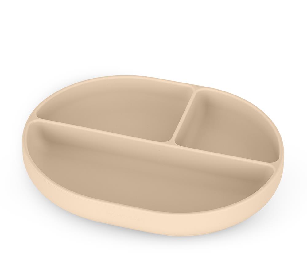 Detský tanier – silikónový, s prísavkou, objem 630 ml, vhodný do mikrovlnnej rúry, odolný proti nárazu, vhodný do umývačky riadu, predelená vnútorná časť, určený od 6 mesiacov, béžová farba, rozmery 3,5 × 21,5 × 17 cm (V׊×H) Zháňate tanier, ktorý uľahčí vašej ratolesti začať jesť pevnú stravu? Potom je tu pre vás detský tanier Petite & Mars. Pýši sa objemom 630 ml, zásluhou čoho umožní podávať dostatočnú dávku obľúben