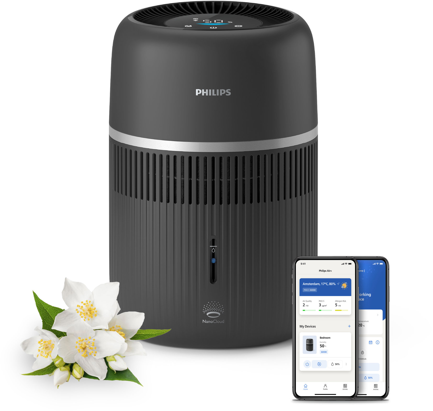 Zvlhčovač vzduchu – vhodný do miestnosti s veľkosťou 44 m², evaporačný, príkon 3 W, zvlhčovací výkon 300 ml/hod., objem nádržky 3,5 l, hlučnosť 25 dB, časovač, podsvietenie, automatické vypnutie, automatický režim, aróma difuzér, nočný režim a mobilná aplikácia, rozmery 22 × 33,4 × 22,2 cm (Š×V×H), sivá a uhľová farba Zvlhčovač vzduchu Philips 4000 Series HU4210/03Hygienické riešenie proti suchému vzduchuOptimálne zvlhčený vzduch mierni svrbenie suchej pokožky, podráždenie dýchacích ciest aj pocity suchých očí. Pro