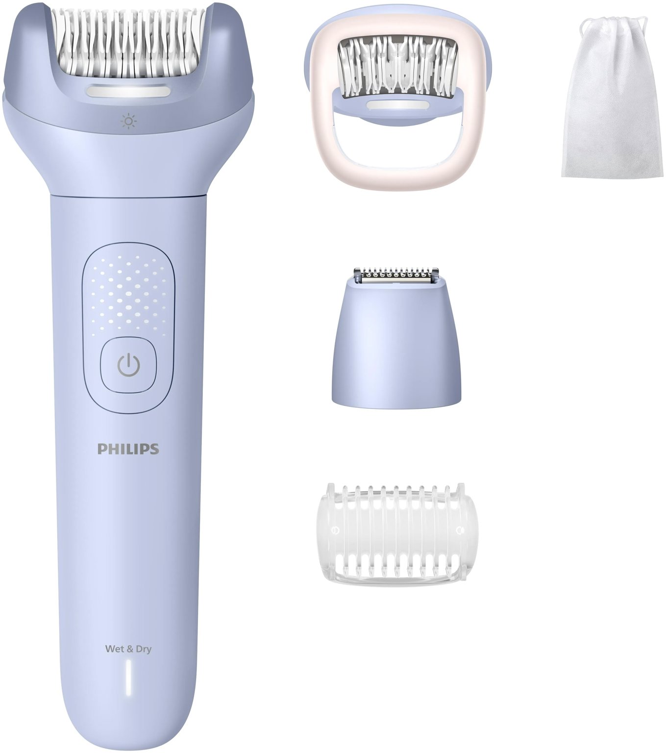 Epilátor – klasický, na nohy, intímne partie a telo, dámsky, epilácia namokro a rýchle nabíjanie, akumulátorové napájanie, 5 nadstavcov, 3 hlavice, puzdro/taštička, zastrihávací nadstavec, holiaca hlavica a epilačná hlavica súčasťou balenia, modrá farba Dámsky epilátor Philips 8000 BRE711/00 je skvelý na šetrné odstraňovanie chĺpkov rovno s korienkami. Bezchybnú depiláciu zabezpečuje 32 obratných pinziet, vďaka ktorým je ošetrenie pokožky rýchle a zb