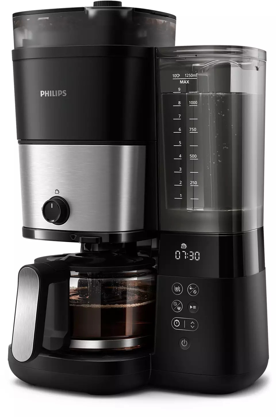 Prekvapkávací kávovar – s mlynčekom, voľne stojací, do domácnosti a do kancelárie, príkon 1000 W, objem kanvice 1,25 l, na prípravu až 10 šálok, umývateľný filter, časovač, Anti-Drip systém a automatické vypnutie, 10 stupňov hrubosti mletia, dva oddelené zásobníky na zrnkovú kávu, nádoba na vodu, displej, ukazovateľ hladiny vody, odmerka a kanvica na kávu v balení, rozmery 24,5 × 43 × 27 cm (Š×V×H), hmotnosť 4,5 kg Philips All-in-1 BrewPrekvapkávací kávovar so zabudovaným mlynčekom HD7900/50Chuť čerstvých zrniek v každej šálkeS kávovarom Philips All-in-one Brew si doprajete lahodnú šálku prekvapkávanej kávy, ked