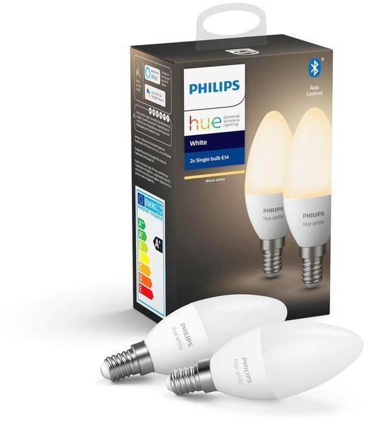 LED žiarovka – inteligentná, energetický štítok F, príkon 5,5 W, 230 V, stmievateľná, svetelný tok 470 lm, teplé svetlo (2700 K), index podania farieb (CRI) 80 Ra, priemer 3,9 cm, Bluetooth, kompatibilita: Apple Home, Philips Hue, aplikácia v angličtine a češtine, životnosť 25000 h, 2 kusy v balení Nie je vyplnený Alternatívny text k fotografii!Smart LED žiarovka Philips Hue White 5,5 W s päticou E14, 2 ks v baleníSpoločnosť Philips, ako špecialista na osvetlenie, uvádza na trh inteligentnú žiar