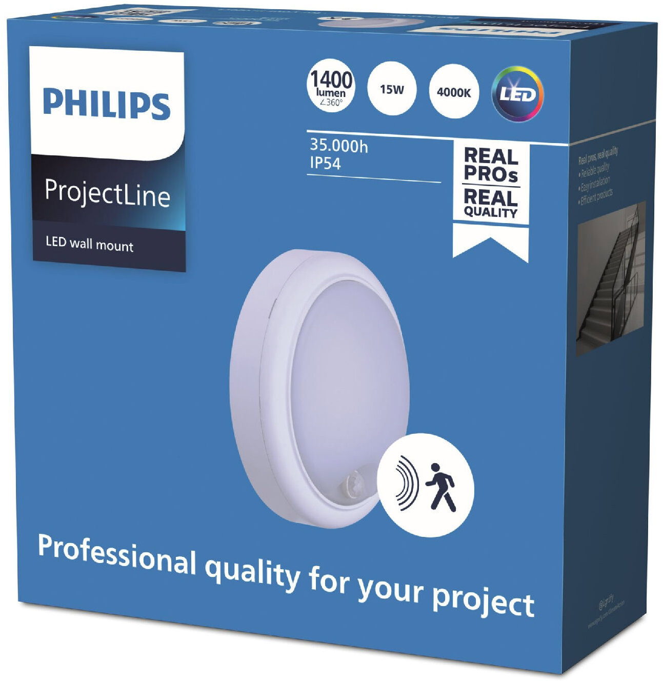 Pracovné svetlo – energeticky úsporné a profesionálne LED (interiérové) nástenné svietidlá ProjectLine s nástenným držiakom, možno ich montovať na steny i stropy, so svojím jasným prirodzeným bielym svetlom a integrovaným senzorom pohybu sú ideálne na chodby, (verejné) vstupné priestory, na osvetlenie verandy, ako bezpečnostné osvetlenie a osvetlenie schodiska