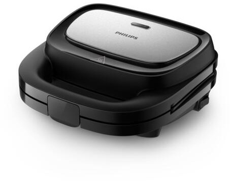 Toustovač – 3 v 1, s vyberateľnými platničkami, na 2 toasty, trojuholníkové platničky, s nepriľnavým povrchom, súčasťou balenia platničky vhodné na sendviče, na vafle, na grilovanie, s ON/OFF spínačom, uzamykateľný, systém na uloženie kábla súčasťou, príkon 750 W, antikorový plášť, čierna farba Philips Series 5000sendvičovač 3 v 1HD2350/80Viac ako len klasický trojuholníkový sendvičVychutnajte si dokonale chrumkavé panini, plnený sendvič s rozpusteným syrom alebo lahodné vafle! Toustovač Phi