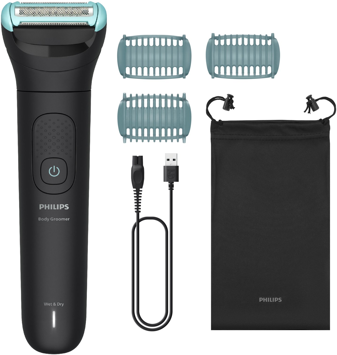 Zastrihávač – na hrudník, intímne partie a podpazušie, pánsky, indikátor stavu batérie, 3 nadstavce, materiál čepelí oceľ, min. dĺžka strihu 0,2 mm, max. dĺžka strihu 5 mm, na akumulátor Philips Series 5000. Vodoodolný zastrihávač tela a…