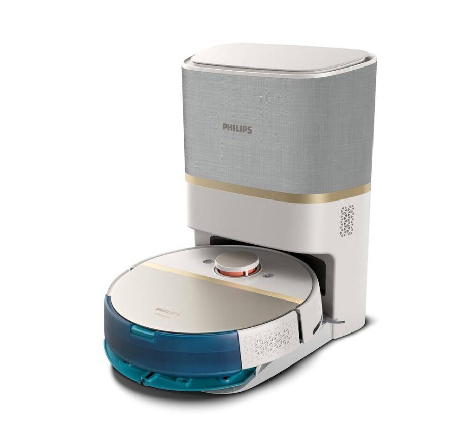 Robotický vysávač – pre alergikov a na zvieracie chlpy, na koberce, pevné podlahy, linoleum a drevené podlahy, na vysávanie, suché čistenie, mokré čistenie, umývateľný filter a filter EPA E11, automatické dobíjanie, pokračovanie upratovania po samostatnom dobití, automatické vysypanie, senzor proti pádu zo schodov, predvoľba miestností na upratovanie a funkcia odloženého upratovania, indikátor plného koša a regulácia výkonu, ovládanie hlasom, mobilnou aplikáciou, objem nádoby na prach 0,26 l, 1 bočná kefa, prekoná prekážky do výšky 2 cm, LiDAR navigácia, batéria Li-Ion, doba chodu 180 min, doba nabíjania 5 h, hlučnosť 65 dB, rozmery 9,7 × 35 × 35 cm (V׊×H), hmotnosť 4 kg, nabíjacia stanica súčasťou balenia, biela a zlatá farba Philips Series 7000 Robot na vysávanie a umývanieXU7100/02Vracajte sa vždy do čistej domácnosti. O vysávanie aj umývanie sa teraz bude starať robot Philips XU7100/02. Ten vyniká vysokým výkonom,