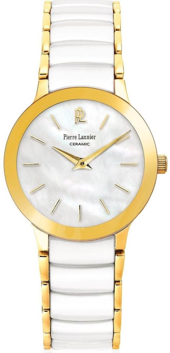 Dámske hodinky – quartz, priemer ciferníka 28 mm, vodotesnosť 30 m (3 ATM), sklíčko minerálne Dámske elegantné hodinky od francúzskej značky Pierre Lannier 013L590 majú nádherný dizajn v zlato-bielom vyhotovení. Sú vyrobené v kombinácii ocele a keramiky, ktorá je veľmi odolná proti poškriabani