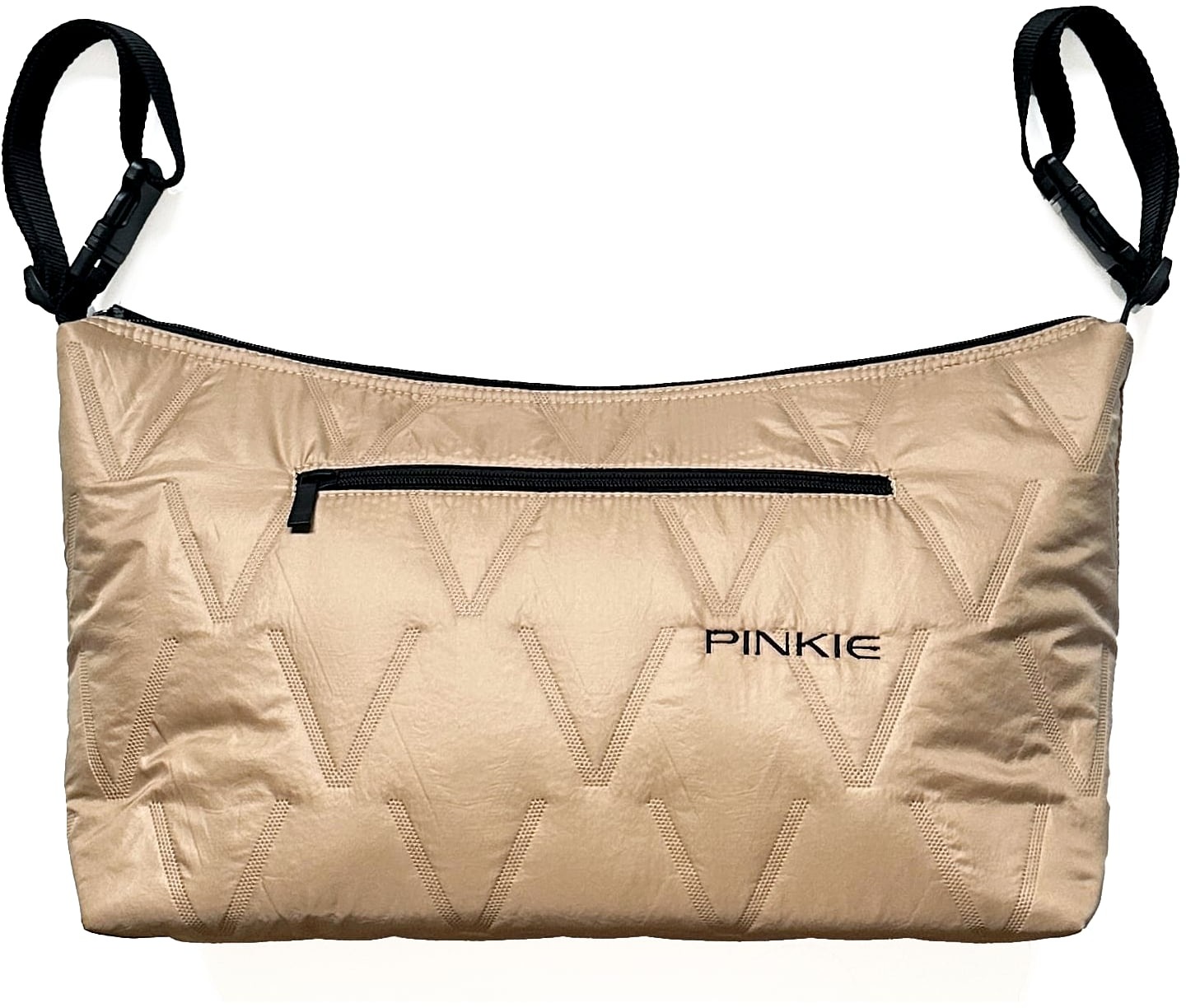 Organizér na kočík – zapínanie na zips, upevnenie pomocou drukov, predné vrecko, celkom 2 vrecká, béžová farba, geometrický motív, rozmery 22 × 35 × 10 cm (V׊×D) S organizérom na kočík Pinkie Organizér Vee Sand…