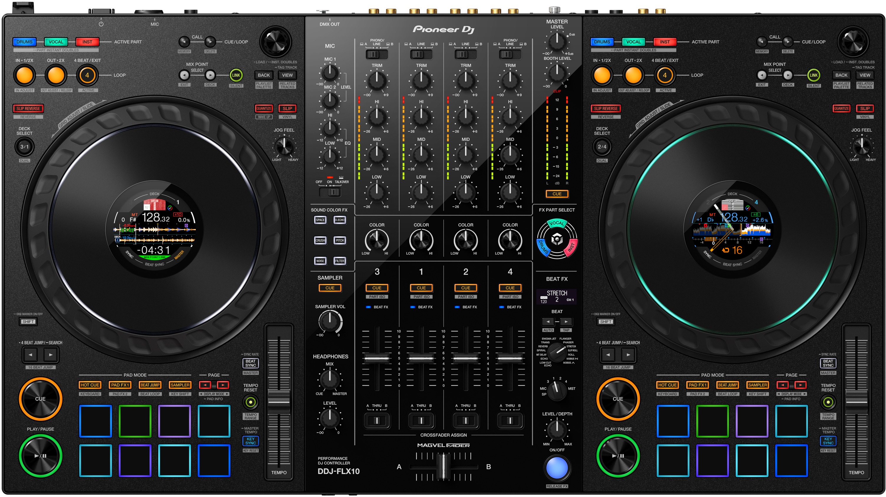 DJ konzola – doplnkové funkcie DVS,, mikrofónny/AUX vstup Jack 6,3 mm, RCA a XLR, hlavný výstup (Master out) RCA a XLR, booth výstup (odposluchový) Jack 6,3 mm, slúchadlový výstup Jack 3,5 mm a Jack 6,3 mm, vo vybavení USB-C, napájanie zo siete, rozmery 716 × 73,4 × 400,3 mm (Š×V×H), hmotnosť 6700 g DJ konzola Pioneer DJ DDJ-FLX10Pioneer DJ DDJ-FLX10 je profesionálna štvorkanálová DJ konzola navrhnutá na maximálnu kreativitu a voľnosť pri mixovaní. Podporuje softvér rekordbox aj Serato DJ Pro a p