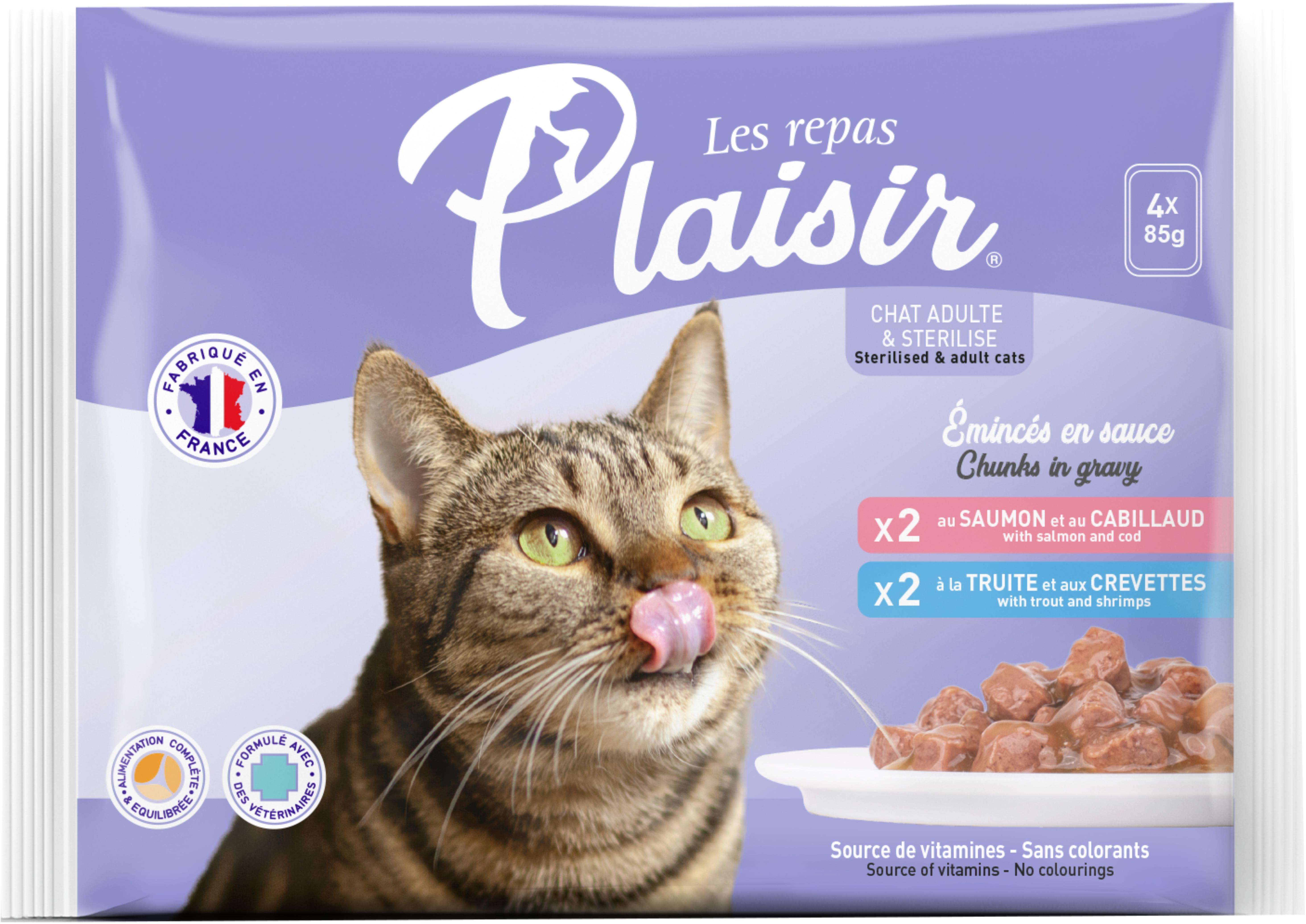 Kapsička pre mačky – určená pre kastrované dospelé mačky všetkých plemien s normálnou aktivitou, príchuť krevetová, lososová, pstružia a tresčia, hmotnosť balenia 0,34 kg Kapsičky Plaisir Cat sú určené pre dospelé mačky malých plemien. Predstavujú kompletné mokré krmivo pre zvieratá s normálnou aktivitou. Balenie obsahuje 2 mäsové vrecká s lososom a treskoua 2 vrecká s