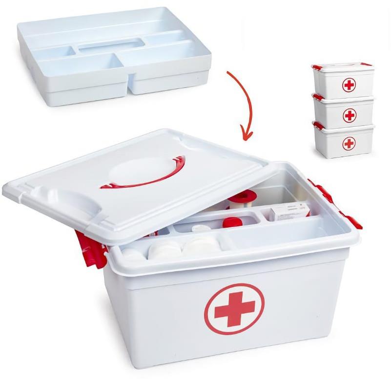 Box – objem 12 l, rozměr 37 × 24 × 18 cm, box obsahuje vložku pro přehledné roztřídění zdravotnického materiálu, barva bílá s červeným křížem a úchyty Pro uskladnění a přenášení zdravotnického materiálu doporučujeme plastový box Forte lékárna s kapacitou 12 l. Vyznačuje se praktickým designem včetně vložky pro přehlednější uložení obsahu. Vyrábí se