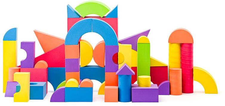 Kocky pre deti – 52 kociek v balení, materiál plast a pena, téma tvary, vhodné od 1 roka Súprava veľkých penových kociek Plastica v PVC taške obsahuje 52 farebných kociek v rôznych tvaroch, vrátane valcov, kvádrov, kociek a polkruhov. Kocky sú vyrobené z mäkkého penového materiálu, vďaka