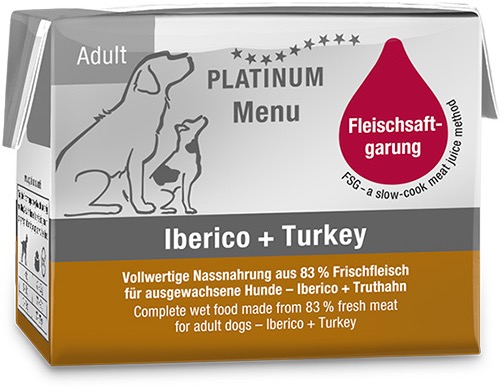 Konzerva pre psov – bez obmedzenia veku s nízkou, normálnou a vysokou aktivitou, morčacia a bravčová príchuť, hmotnosť balenia 1,08 kg, 12 ks v balení, mokré, hrubé bielkoviny 14,5 %, tuky 9 %, bez obilnín, špecifiká zloženia bez konzervantov, bez GMO a bez soli Paštéta Platinum Natural Menu Iberico + Moriak obsahuje 83 % mäsa. Pyrenejské ošípané sú krížencami domácich a diviakov a majú v sebe niečo od každého. Ich mäso chutí ako divoké diviačie a vďaka jedin