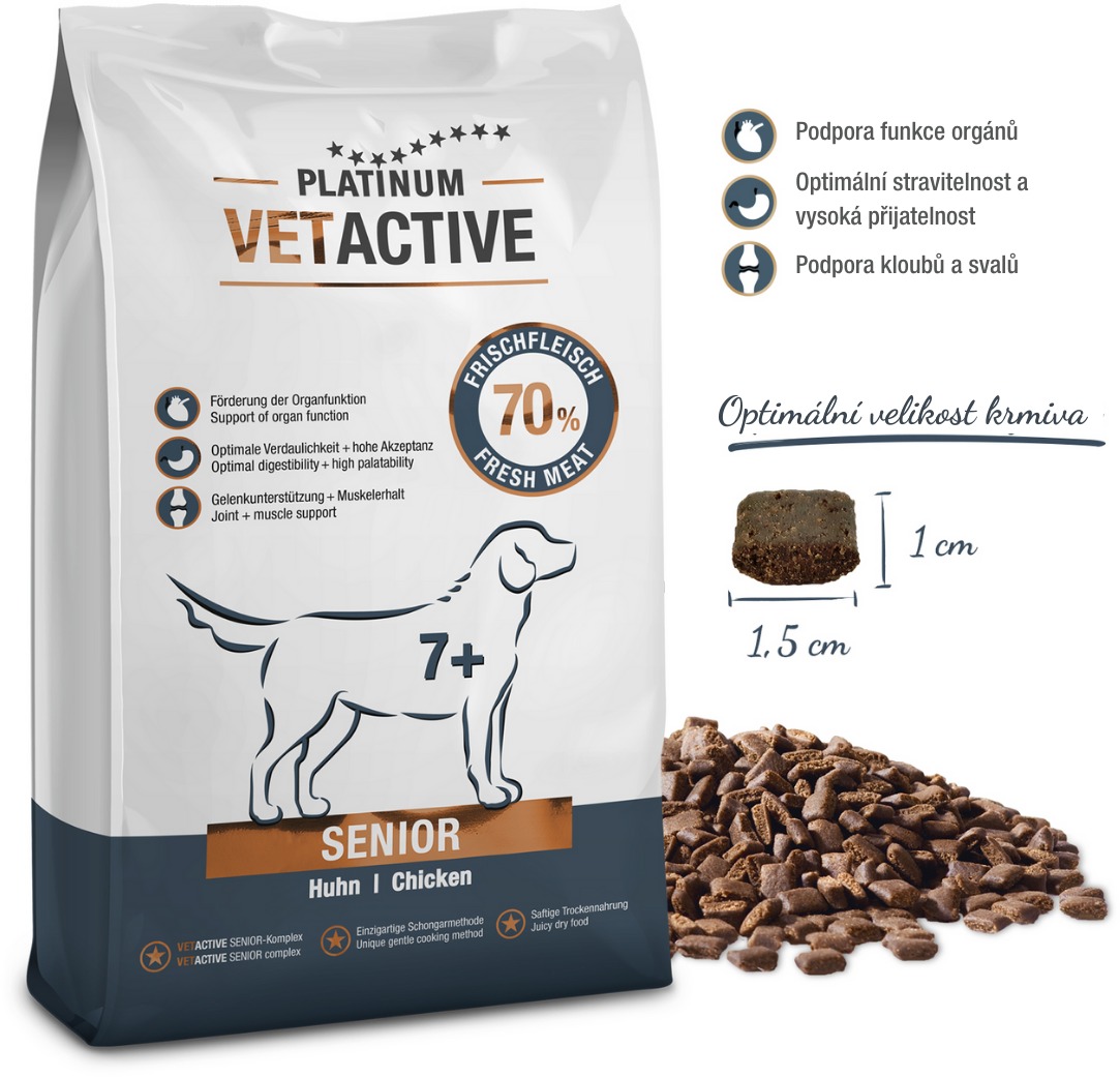 Diétne granule pre psov – pre všetky seniorské plemená s nízkou a normálnou aktivitou, hmotnosť balenia 5 kg, receptúra: kuracia, čerstvé mäso v sušine 70 %, hrubé bielkoviny 25,8 %, tuky (kurací) 12 %, bez obilnín, indikácie rekonvalescencia, nákupom tohto produktu prehlasujete, že vaše zviera podstúpilo vyšetrenie u veterinára a diétne krmivo mu bolo odporučené na základe stanovenej diagnózy Ľahko stráviteľné prírodné zloženie granúl PlatinumDoprajte svojmu psovi chutné a stráviteľné krmivo diétne granule pre psov Platinum Vetactive senior 5 kg. Krmivo VetActive Senior je špeciálne n