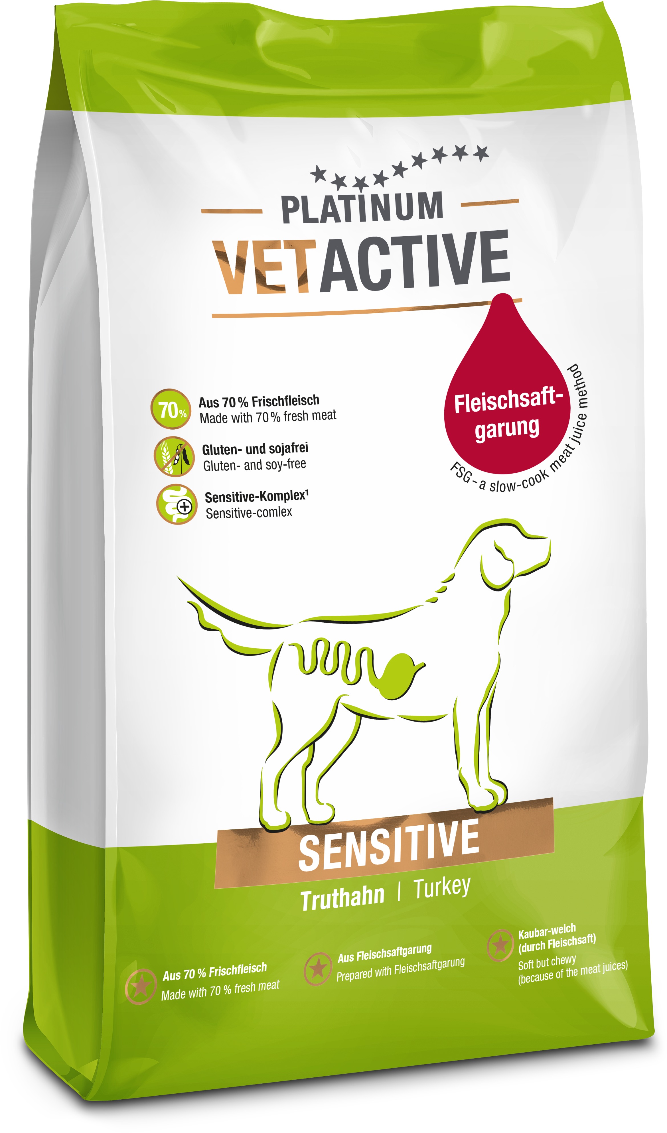 Granuly pre psov – bez obmedzenia veku s nízkou, normálnou a vysokou aktivitou, morčacia príchuť, hmotnosť balenia 5 kg, polovlhké, hrubé bielkoviny 23 %, tuky (hydinový) 11 %, bez obilnín, špecifiká zloženia bez konzervantov, bez GMO a sensitive Platinum VetActive Sensitive je kompletné polovlhké krmivo určené pre psov všetkých vekových kategórií a úrovní aktivity, ktoré trpia zažívacími ťažkosťami, ako sú časté hnačky alebo žalúdočné problém