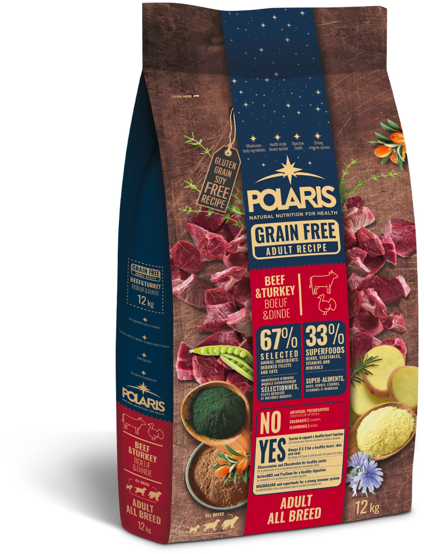 Granuly pre psov – dospelého veku s normálnou aktivitou, hovädzia a morčacia príchuť, hmotnosť balenia 12 kg, suché, tuky (hydinový) 13 %, s kĺbovou výživou, bez obilnín, špecifiká zloženia bez konzervantov, kvasnice a s obsahom juky Polaris Adult bezobilné granule pre psov s čerstvým mäsomS hovädzím a morčacím, 12 kgZáleží vám na tom, aby váš maznáčik dostával presne to, čo k životu potrebuje? Chcete mu dopriať tú správnu výživu