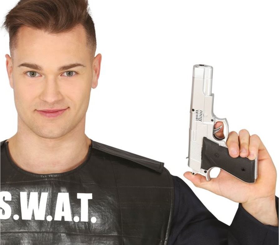 Doplnok ku kostýmu – zbraň, čierna a strieborná farba, materiálom je plast, súčasť balenia: zbraň