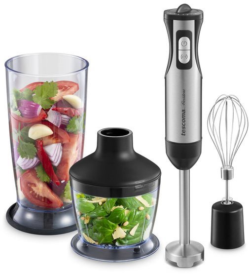 Tyčový mixér – príkon 800 W, 6 rýchlostí, nadstavce vhodné do umývačky, plynulá regulácia rýchlosti a turbo rýchlosť, funkcie: sekanie, šľahanie a mixovanie, 1 nôž, maximálne otáčky 16000 ot./min, sekáčik so sekacou nádobou, mixovacia nádoba a šľahacia metla súčasťou balenia, materiál nohy nerez Profesionálny tyčový mixér Tescoma je obľúbený, jednoduchý a skladný spotrebič, pritom vám veľmi uľahčí prípravu všetkých zdravých smoothies, zeleninových pyré, kaší, dipov aj pravej domácej majonézy.
