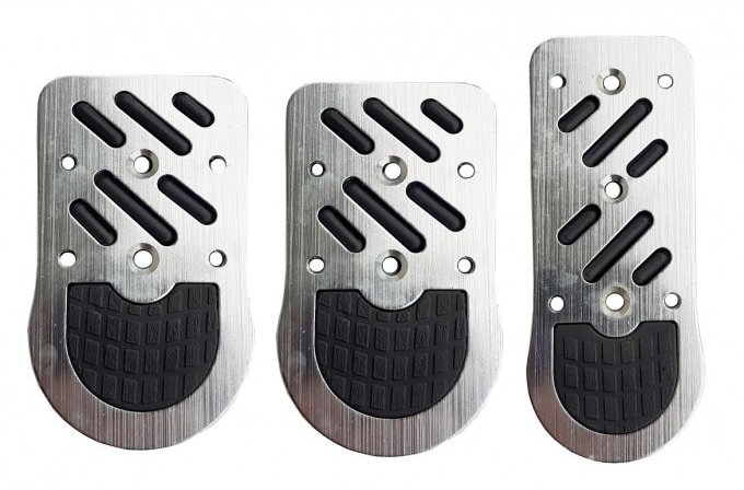 Nášľapy pedálov do auta – pripevnenie pomocou úchytov na zadnej strane výrobku, alebo priskrutkovaním priamo na pedále, určené pre spojkový, brzdový a plynový pedál, materiál kov a guma, pedál plynu 48 × 115 mm, pedál brzdy 55 × 95 mm, pedál spojky 55 × 95 mm