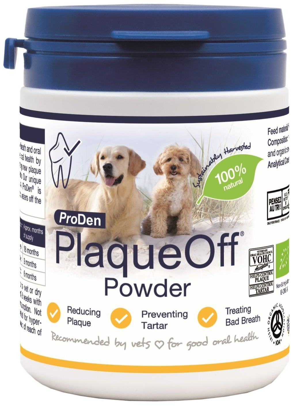 Doplnok stravy pre psov – a mačky, významne obmedzuje zubný plak a zubný kameň a odstraňuje zápach z tlamy psov a mačiek Výživový doplnok ProDen PlaqueOff Powder významne obmedzuje zubný povlak a zubný kameň a odstraňuje zápach z papule psov a mačiek. Ide o prelomový prostriedok v starostlivosti o zuby a ďasná psov a ma