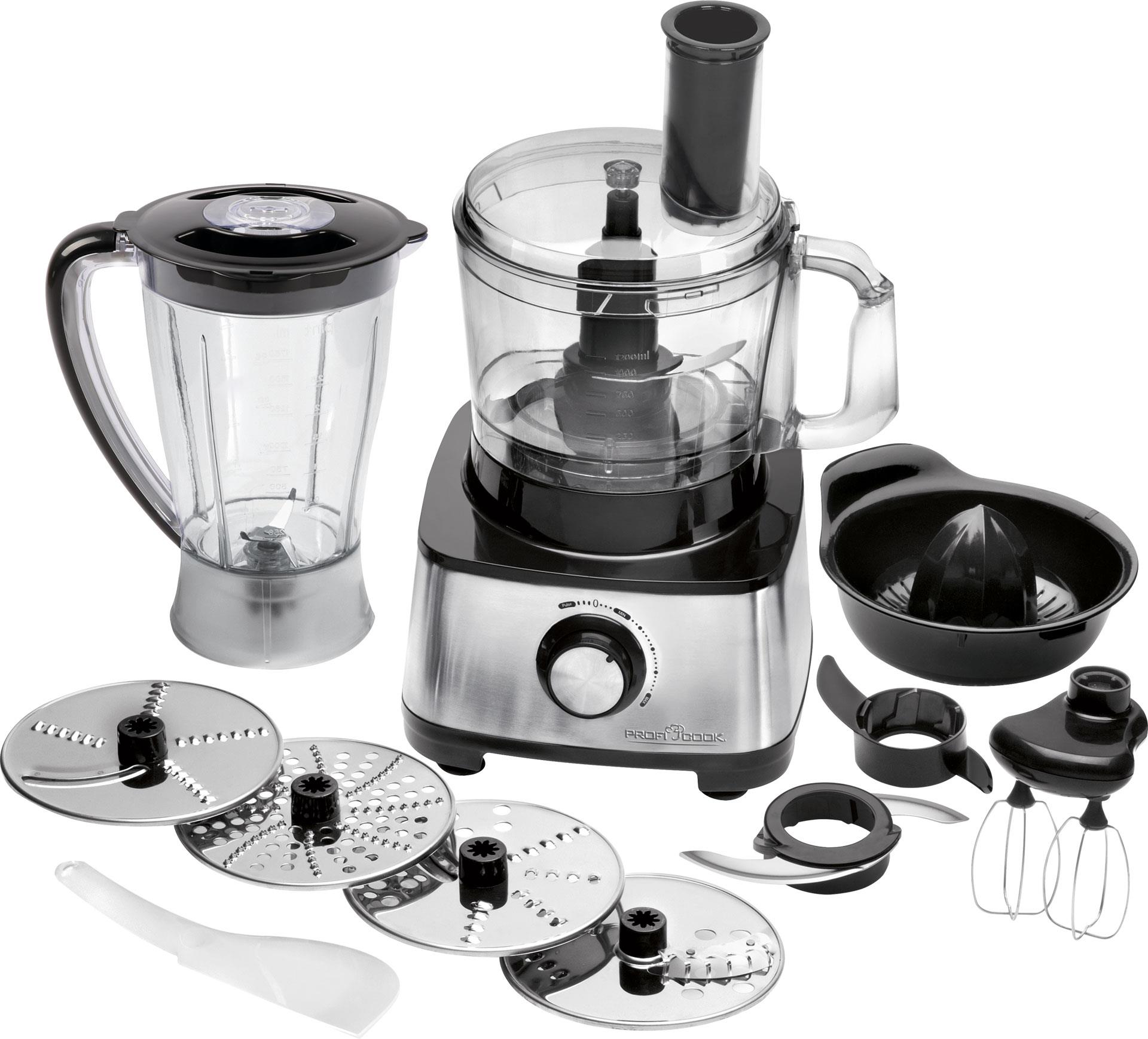 Food processor – telo z nehrdzavejúcej ocele, príkon 1200 W, plynulá regulácia otáčok, funkcie turbo, pracovná misa 1.2 l s ryskami, plniacim otvorom a prídavným vekom, miešacia misa 1.75 l s ryskami a plniacim otvorom, citrusovač, 2× strúhadlový kotúč a 2× rezný kotúč, zemiakový rošt, sekáčik, šľahacia metla, hnetacia metla a škrabka, prísavné nožičky, priestor na napájací kábel S vysoko výkonným kuchynským robotom ProfiCook – KM 1063 z nehrdzavejäcej ocele nájdete v balení aj celý rad príslušenstva, ktoré z prístroja urobí multifunkčný stroj. Robot m