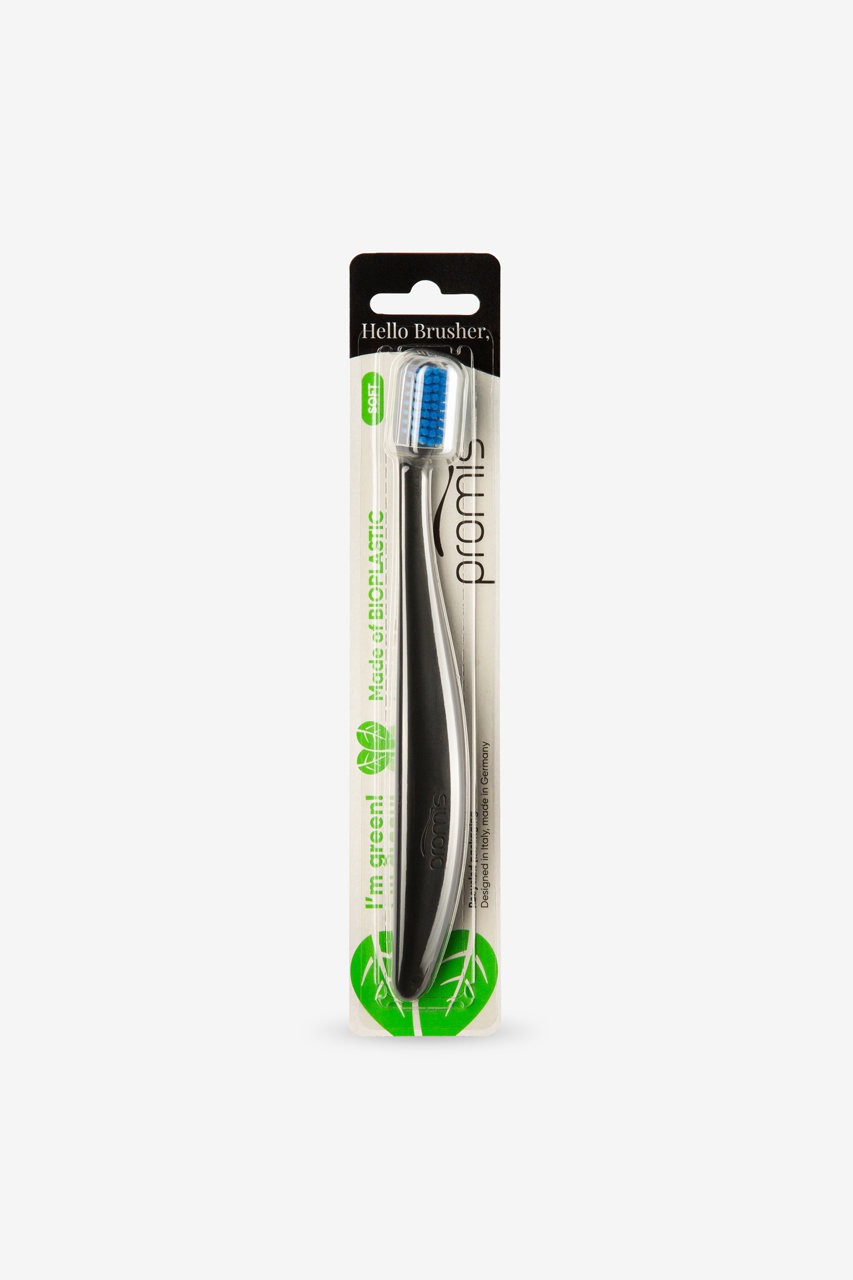 Zubná kefka – soft, nylonové štetiny, plastová, cestovná, ergonomický tvar a eko, čierna a modrá farba