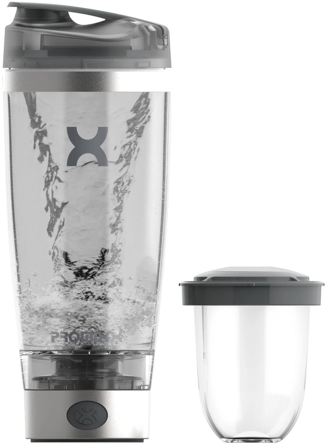 Shaker – tritanový, zacvakávací, elektronický, objem 0,6 l, zásobník v balení, sivá farba PROMiXX Pro je elektrický a dobíjací shaker, ktorý vám pripraví dokonale hladké proteínové nápoje bez námahy. Okrem proteínových nápojov je vhodný aj na iné práškové doplnky, vajcia, omelety aj kávu.