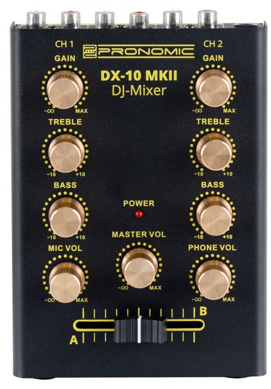Mixážny pult – analógový, 2 kanály, vstupy: 1× 6,3 mm Jack, 4× RCA, výstupy: 2× RCA, 6,3 mm Jack slúchadlový výstup, ekvalizér Dvojkanálový analógový mixážny pult Pronomic DX-10 MKII vyniká pevnou konštrukciou a kompaktnými rozmermi, takže ho môžete pohodlne používať ako v domácom štúdiu, tak aj pri hudobných produkciách na c