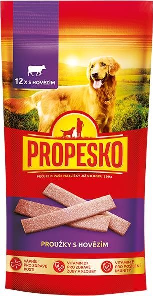 Maškrty pre psov – bez obmedzenia veku s normálnou aktivitou, hovädzia príchuť, hmotnosť balenia 0,12 kg, 12 ks v balení, suché, tuky (rastlinný) 18 % Propesko snack prúžky s hovädzím 120 g sú rozmanité odmeny…