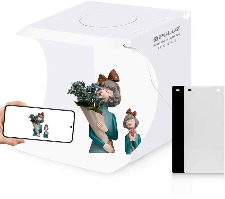 Príslušenstvo k fotoaparátu – prenosný skladací fotostan, rozmery 24 × 23 × 23 cm, 550 lm LED osvetlenie, 20 LED diód, USB napájanie 5 V/2 A, 2 pozadia (čierne, biele), eliminácia tieňov a odleskov, rýchla montáž, jednoduché prenášanie, ideálny pre malé produkty PULUZ 20 cm skladacie prenosné 550LM fotosvetlo je ideálnym riešením pre fotografov, tvorcov obsahu aj predajcov, ktorí chcú ľahko a rýchlo zachytiť kvalitné snímky malých produktov. Vďaka vstavanému