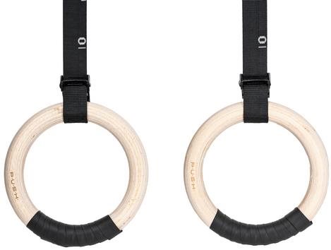 Gymnastické kruhy drevené, vrátane popruhov, celková nosnosť 200 kg, priemer kruhu 24 cm, priemer úchopu 3,2 cm, popruhy sú dlhé 457 cm, široké 3,8 cm, nastaviteľné, na domáce použitie a možnosť používať vonku, farba kruhu béžová a farba popruhu čierna Drevené gymnastické kruhy PUSH sú vhodné na vonkajšie workout. Cvičenie s vlastnou hmotnosťou je zárukou efektívneho posilňovania prakticky akýchkoľvek partií. Kruhy sú vyrobené tak, aby sa dali ľahko