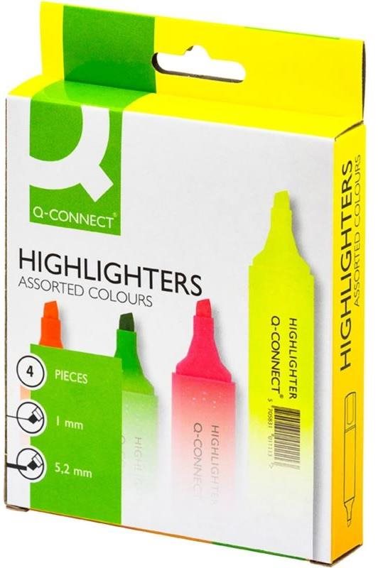 Zvýrazňovač na domáce aj kancelárske použitie, skosený hrot, max. šírka stopy 5,2 mm, 4 ks v balení, farba: červená, oranžová, zelená, žltá Zvýrazňovače patria k základnému vybaveniu nielen každého školáka, ale aj kancelárie. Ak máte radi organizáciu a chcete si urobiť poriadok vo svojich poznámkach, zvýrazňovač Q-Connect si ihneď zamiluj
