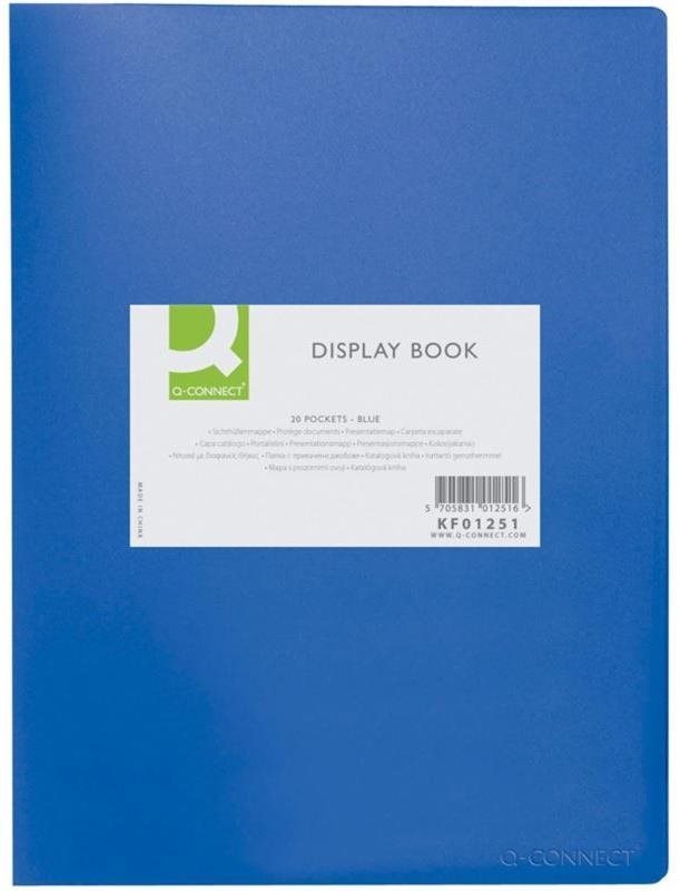 Dosky na dokumenty A4 – plastové, katalógová kniha, chlopne vo vnútri, 20 priehradiek, na 40 listov, bez zatvárania, modrá farba, rozmery 29,7 × 21 cm (V׊) Katalógová kniha Q–CONNECT je vhodná na katalogizáciu prospektov, letákov a iných podobných listín. Tvorená je pevnými doskami a polypropylénovými obalmi typu U, ktoré sú zvarené v chrbte. Obsahuje 20