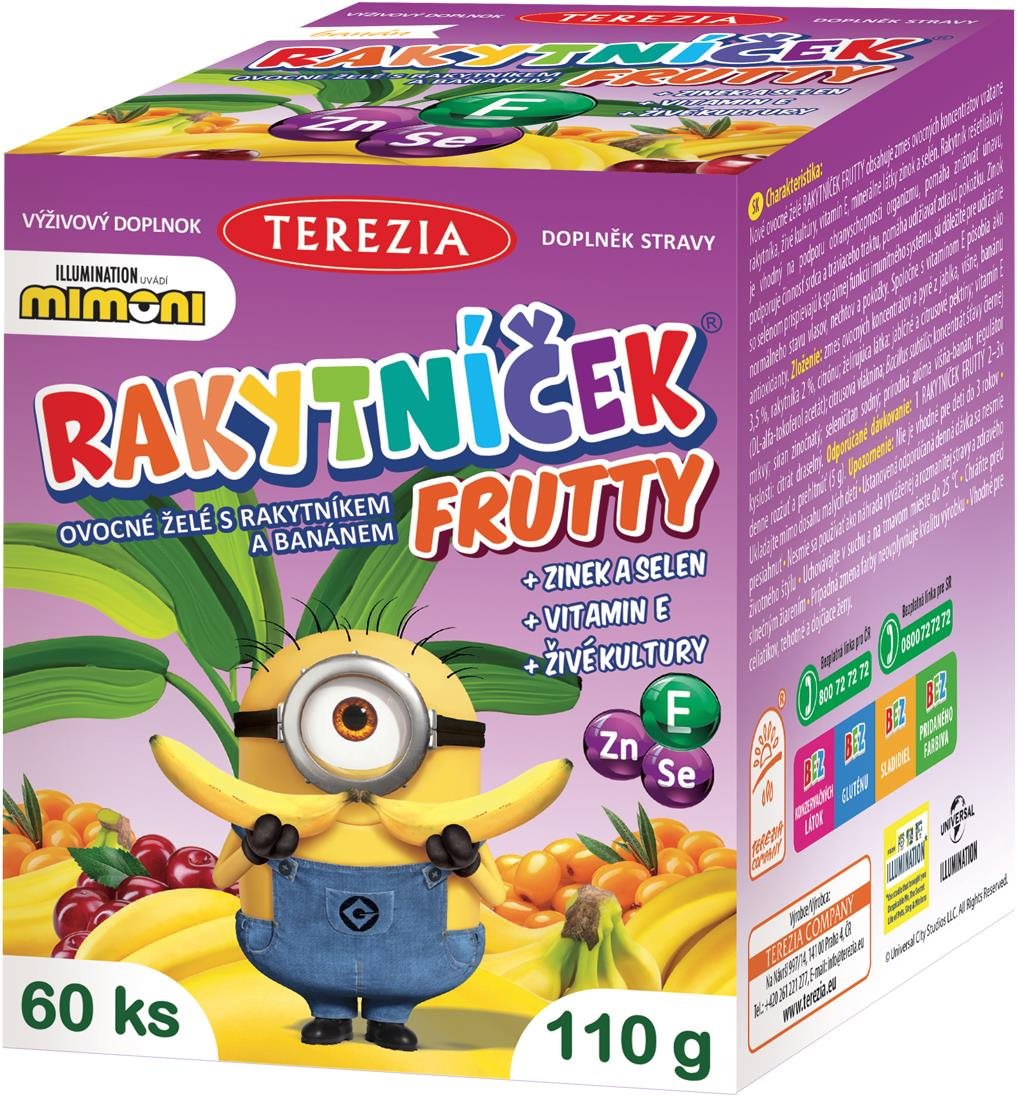 Multivitamín – želé, hmotnosť 110 g, určený pre deti, pre tehotné a pre dojčiace, od 3 rokov RAKYTNÍČEK Frutty Mimoni banán60 kusovNové ovocné želé RAKYTNÍČEK FRUTTY obsahuje zmes ovocných koncentrátov vrátane rakytníka, živej kultúry, vitamín E, minerálne látky zinok a selén. Rakytník rešetl
